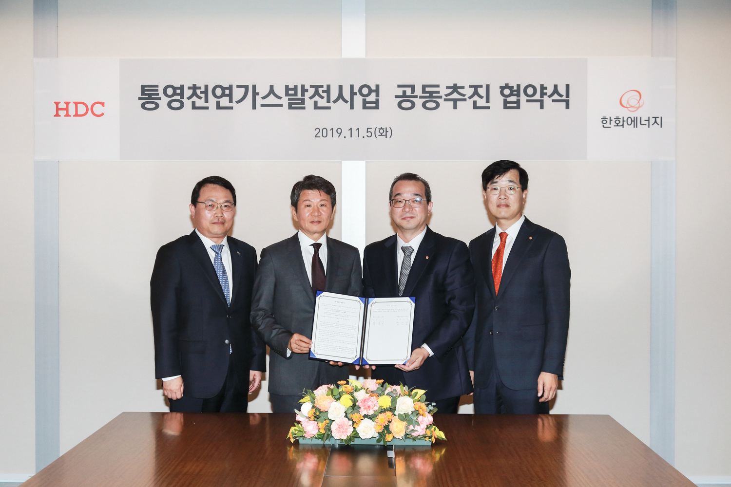 HDC (Chairman Mong-gyu Chung) and Hanwha Energy (CEO In-seop Chung) signed a joint promotion agreement for Tongyeong Natural Gas Power Plant on November 5 at the HDC Building in Samsung-dong.