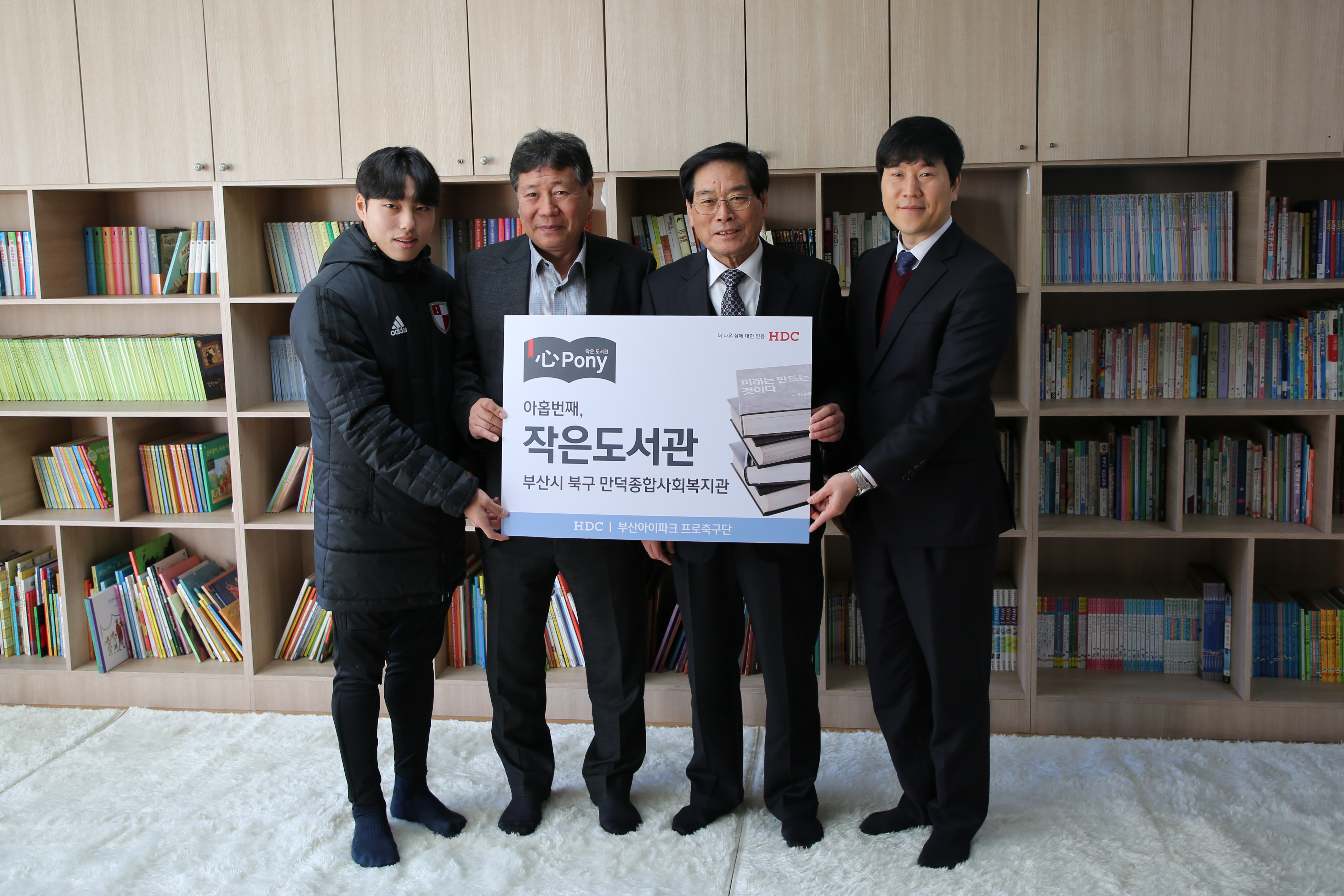 부산아이파크와 현대산업개발이 따뜻한 손길을 나누기 위해 힘을 합쳤다. 부산 강서구, 북구, 서구 내에 한 곳씩 선정하여 총 세 곳에 도서 및 기자재 지원을 진행했다. 부산아이파크에서는 임직원과 부산 축구의 미래를 책임질 김정호, 이동준 부산 유스 출신의 프로 선수가 나섰고 현대산업개발에서는 어린이들을 위한 책 3,000여권과 책장, 책상, 쇼파 등을 지원했다.