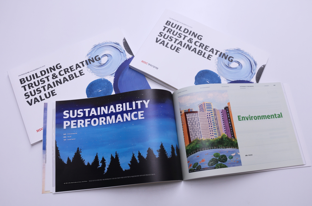 <사진2> HDC현대산업개발이 한국ESG기준원(KCGS)의 2025년 ESG 평가 및 등급 공표에서 2년 연속 통합 A등급을 획득했다. (장애인 예술단이 직접 그린 그림이 적용된 HDC현대산업개발의 2025 지속가능경영보고서)