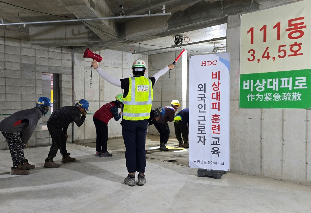 HDC현대산업개발은 건설 현장 외국인 근로자의 의사소통 어려움으로 인한 안전사고 예방을 위해 안전교육과 비상사태 대비훈련을 진행했다.
