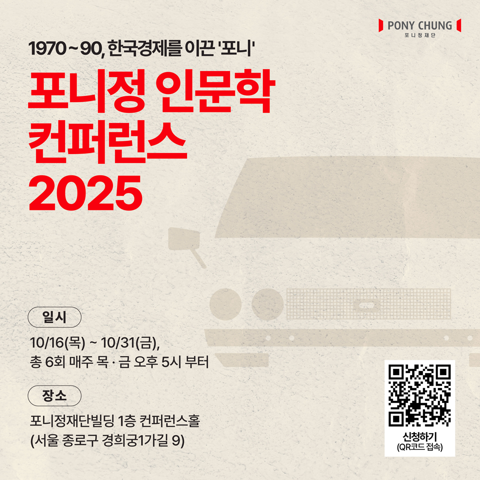 포니정이 생전에 남긴 각종 경영자료와 메모 등의 기록을 기반으로 한국의 산업·경제·사회·문화 등 각 분야의 혁신과 변화의 동력을 다양한 관점에서 조망한 ‘포니정 아카이브 연구총서’ 연구진이 주요 강연자로 나서는 <포니정 인문학 컨퍼런스 2025>는 10월 16일부터 31일까지, 매주 목요일과 금요일 오후 5시에 서울 종로구 경희궁1가길에 위치한 포니정재단빌딩 1층 컨퍼런스홀에서 열린다.
