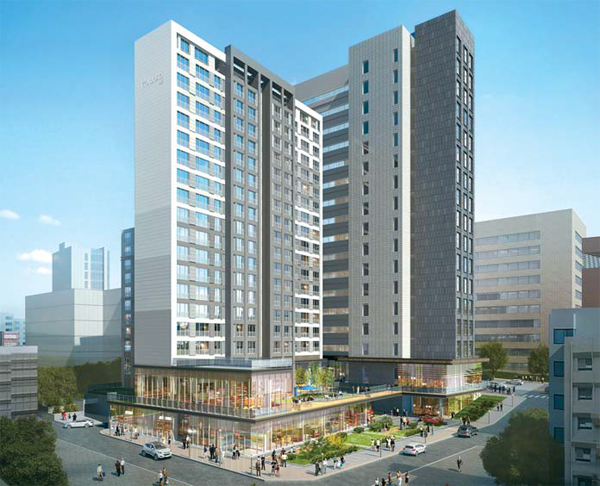 전용면적 47㎡는 54가구, 전용 59㎡는 43가구다. 전용 84㎡는 2가구뿐이다. 오피스텔은 194실이다. 전용면적별로는 △26㎡ 45실 △27㎡ 135실 △33㎡ 14실이다. 원룸형과 복층형 구조로 나뉜다.