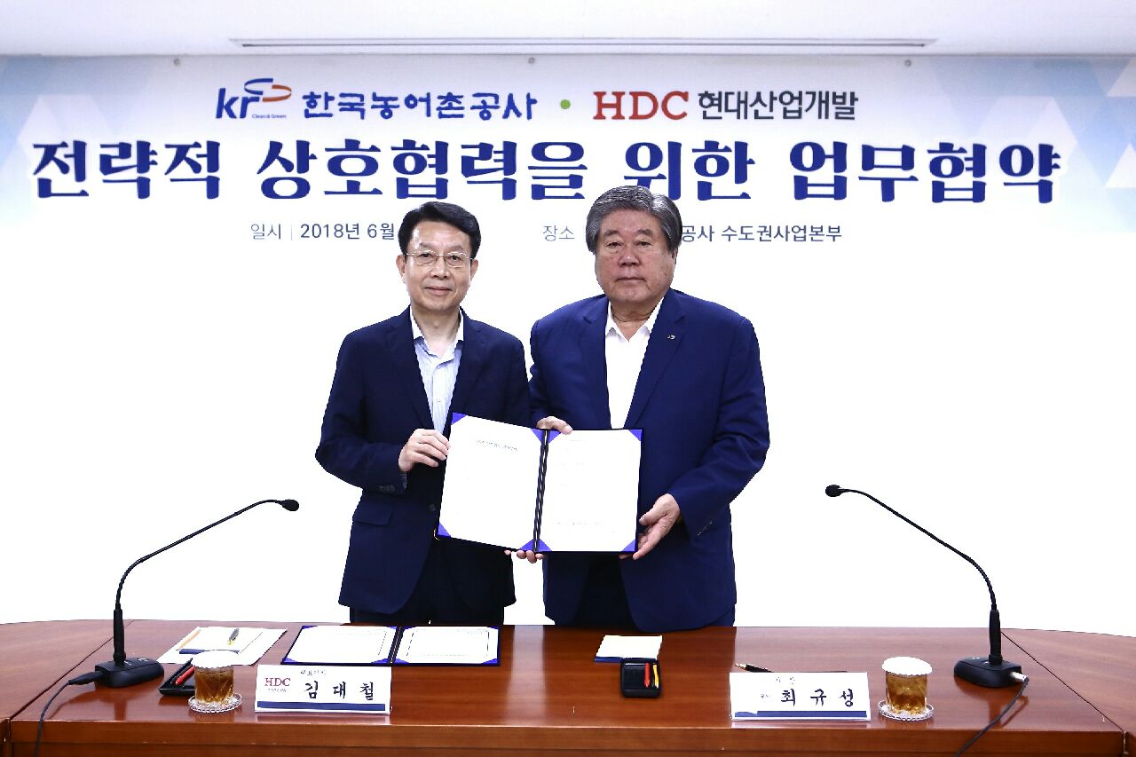 HDC현대산업개발과 한국농어촌공사는 29일 경기도 수원시 한국농어촌공사 수도권사업본부에서 업무협약을 체결하고 민·관 합동 사업모델 발굴 및 추진에 협력하기로 했다. 이날 행사에는 HDC현대산업개발 김대철 사장, 박희윤 개발운영사업본부 본부장, 한국농어촌공사 최규성 사장, 이종옥 부사장, 조석호 수도권사업본부장 등이 참석했다.