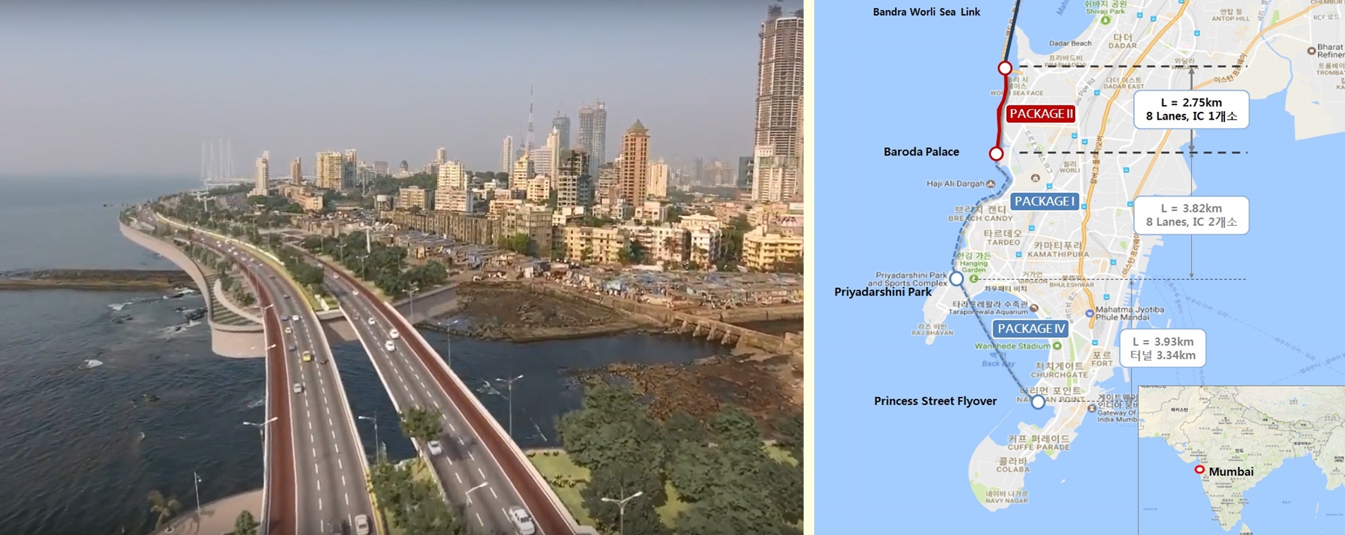 이번 공사는 인도의 뭄바이시(MCGM, Municipal Corporation of Greater Mumbai)에서 발주한 Build & Design 방식의 사업으로 뭄바이시 Bandra Worli Sea Link 남쪽에 위치하며, 총연장 2.75km구간에 교량 0.9km 및 인터체인지(Interchange)와 진입램프 3.2km, 해안제방 1.9km, 25만㎡의 부지 등을 복합 조성하는 해안도로 공사이다. 공사기간은 2018년 10월부터 2022년 09월까지 48개월이며, 완공시 Bandra Worli Sea Link에서 Bandra Palace까지 연결된다. 향후 총연장 14.2km의 뭄바이 해안도로가 완공되면 뭄바이 도심지 주변 해안을 종단하는 중심 도로축이 될 전망이다.