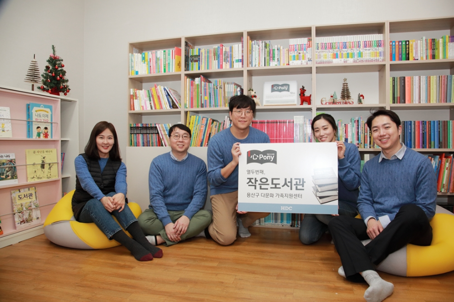 HDC현대산업개발은 11월 20일(화)~21일(수) 용산구 다문화가족지원센터와 한남동 작은 도서관 두 곳에 ‘心Pony 작은 도서관’ 12, 13호점을 지원하는 사랑나눔 릴레이 사회공헌 봉사활동을 진행했다. HDC현대산업개발의 ‘心Pony 작은 도서관’은 Pony가 애칭이었던 故정세영 명예회장의 인재중시 철학(心)을 계승한다는 의미가 담겨있으며, 지난 2014년 4월 전북 군산 온누리 공부방을 시작으로 경북 문경, 경남 밀양, 경기 평택, 서울 용산, 동대문, 구로, 거제 등 현재 전국에 총 11곳이 운영되고 있다.