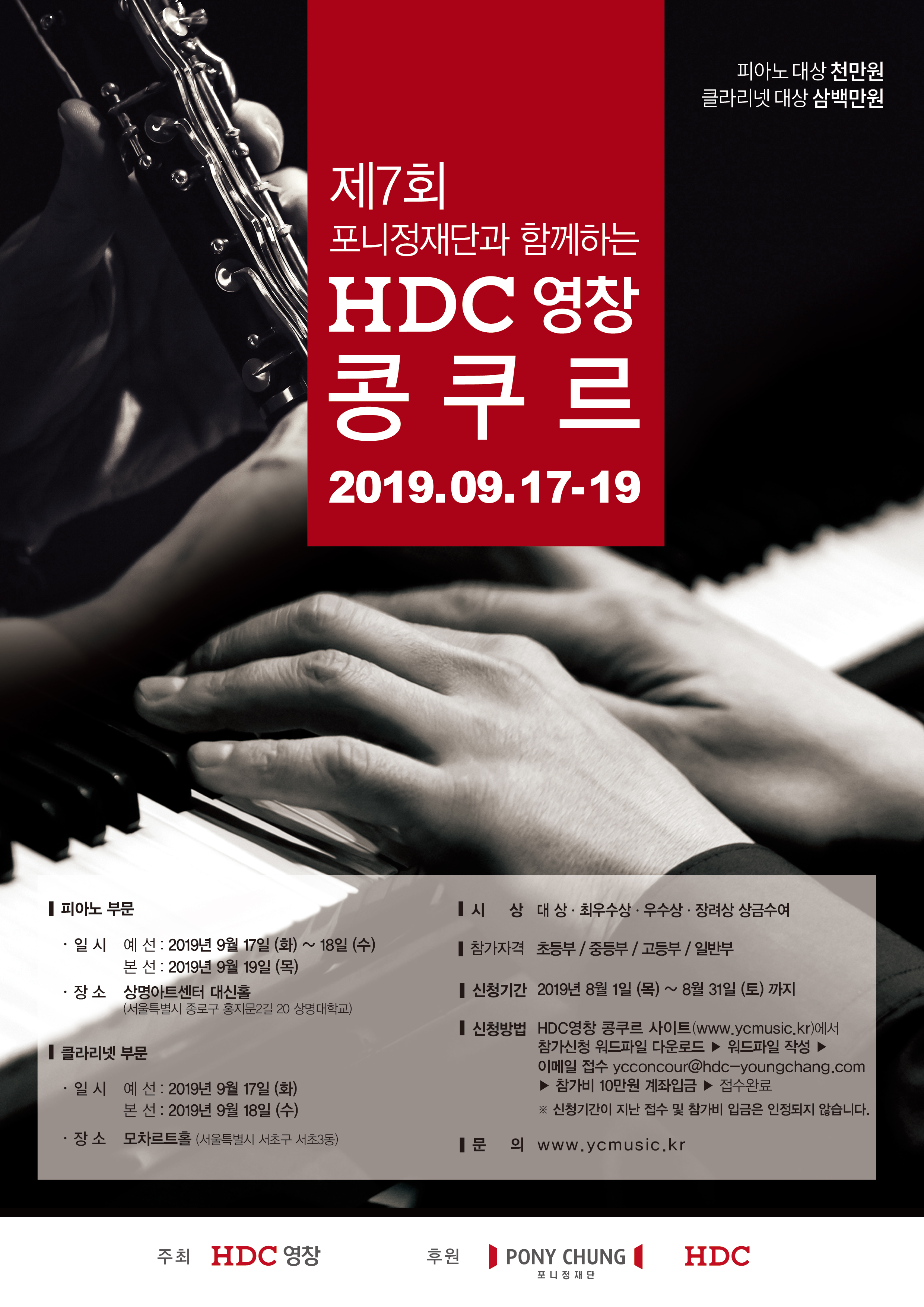 올해로 7회를 맞는 HDC영창콩쿠르는 클래식의 대중화와 젊은 음악 인재 발굴을 지향하는 순수 장학사업으로 오는 9월17일(화)부터 19일(목)까지 상명아트센터 대신홀에서 피아노 부문이 진행되고, 17일(화)과 18일(수) 서울 서초구 모차르트홀에서는 클라리넷 부문이 나누어 진행된다.