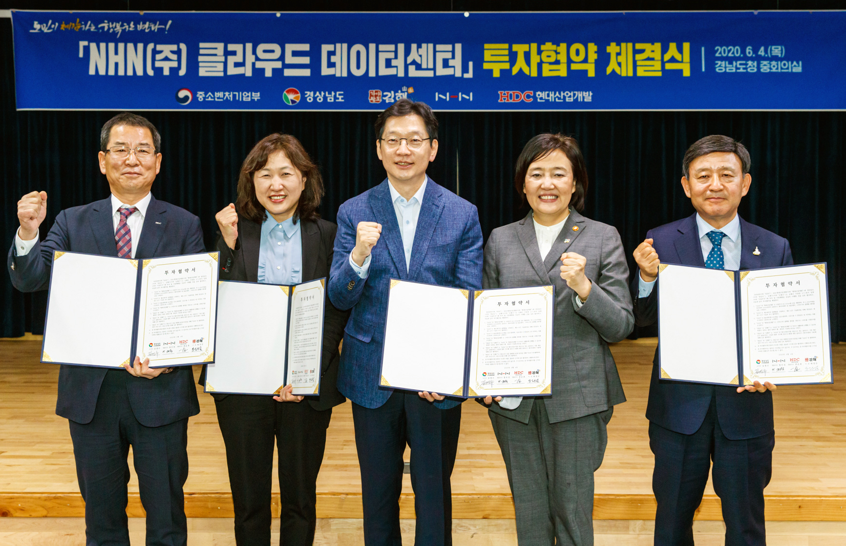 HDC현대산업개발(대표 권순호, 정경구)과 NHN(대표 정우진)은 4일 오후 1시, 경상남도(도지사 김경수), 김해시(시장 허성곤)와 데이터센터 및 스마트시티 플랫폼 센터 구축에 대한 투자협약을 체결했다.