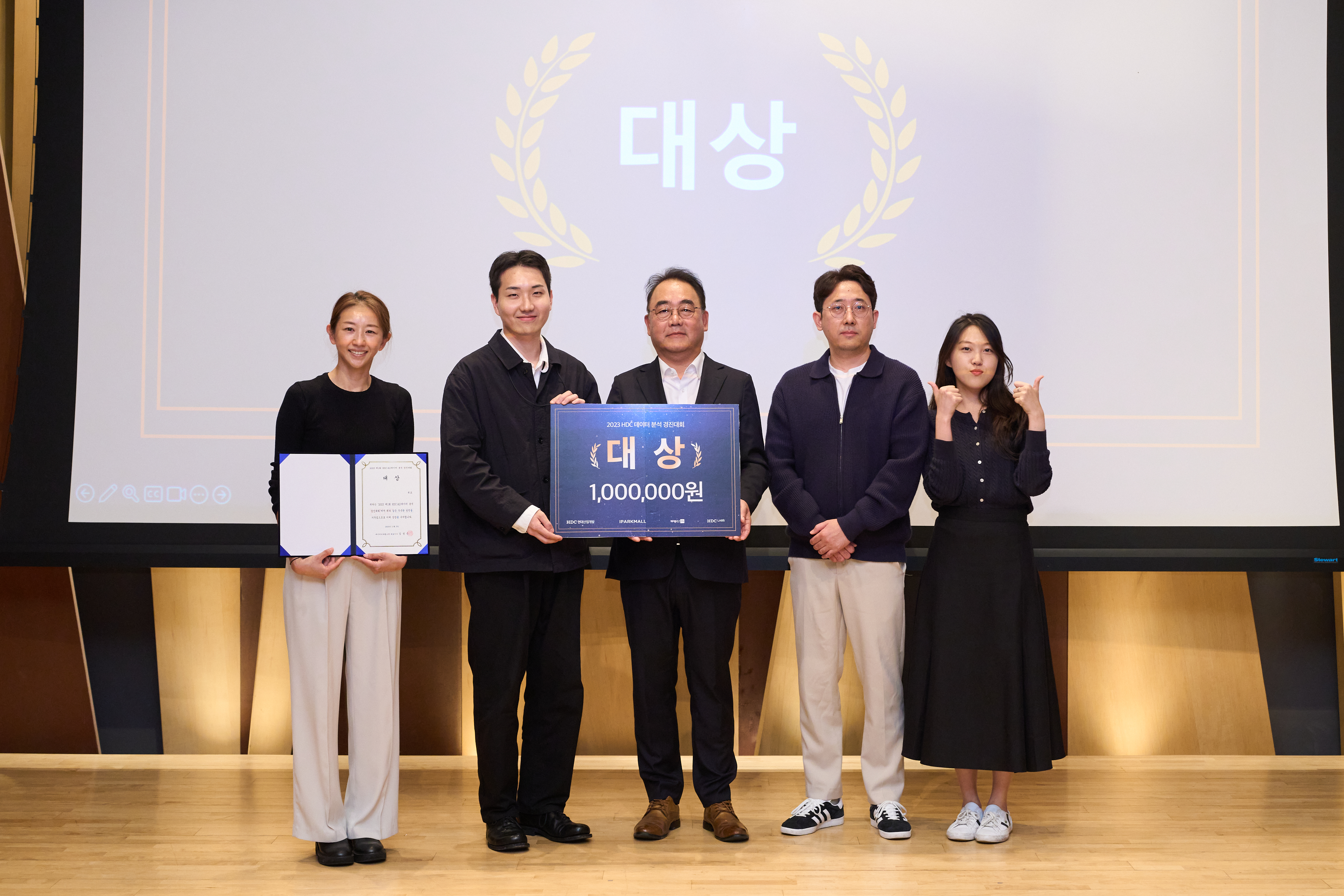 분석 경진 대회 대상 수상팀과 HDC랩스 김성은 대표(가운데)