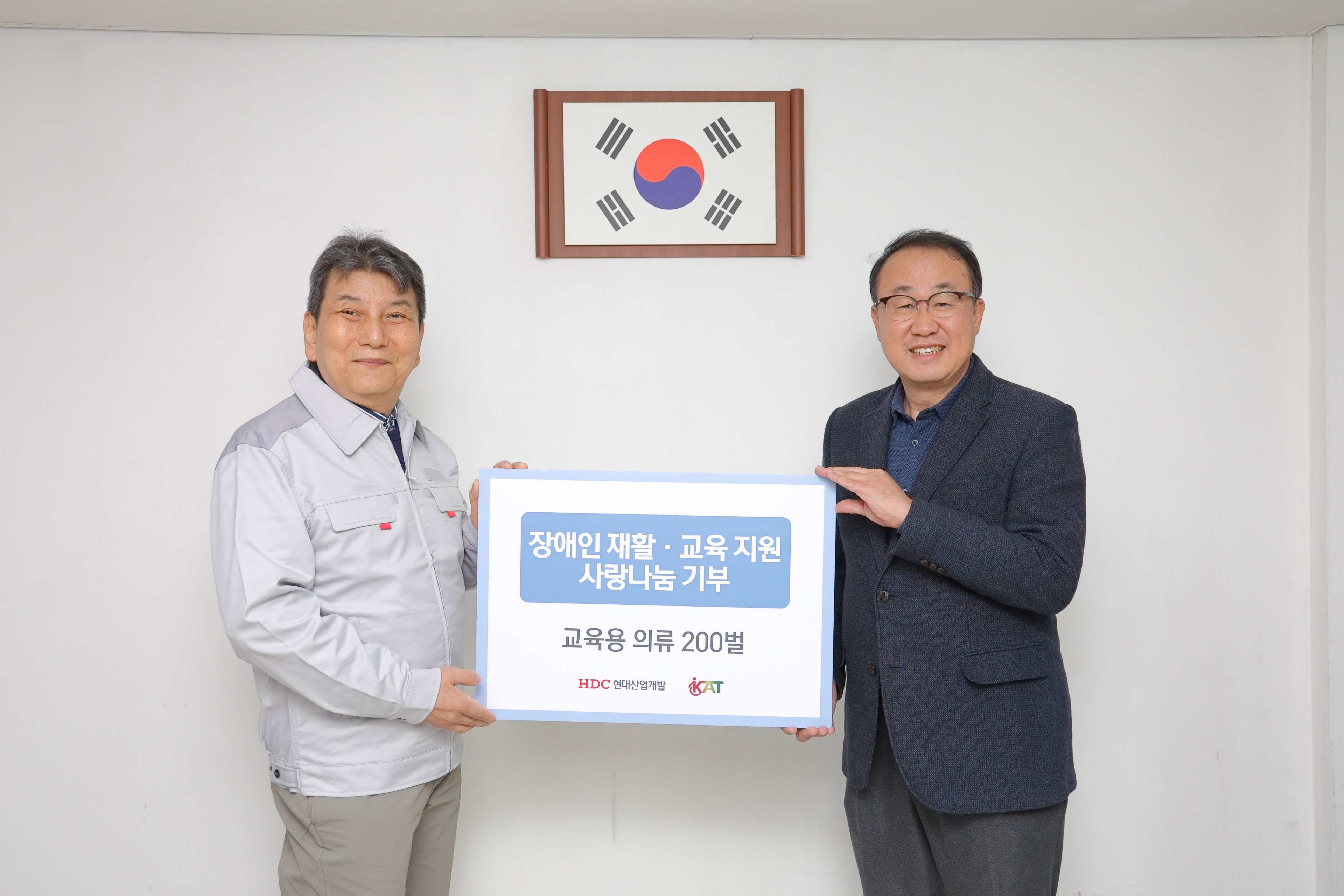 지난 1일 서울시 강남구에 있는 한국 장애인 농축산기술협회에서 열린 기부식은 홍귀표 한국 장애인 농축산기술협회장, 신왕섭 HDC현대산업개발 실장 등이 참석한 가운데 진행됐다. HDC현대산업개발이 이날 전달한 교육용 의류 200벌은 장애인의 작업 활동을 위한 교육지원 사업과 자립 지원을 위해 쓰여질 계획이다.