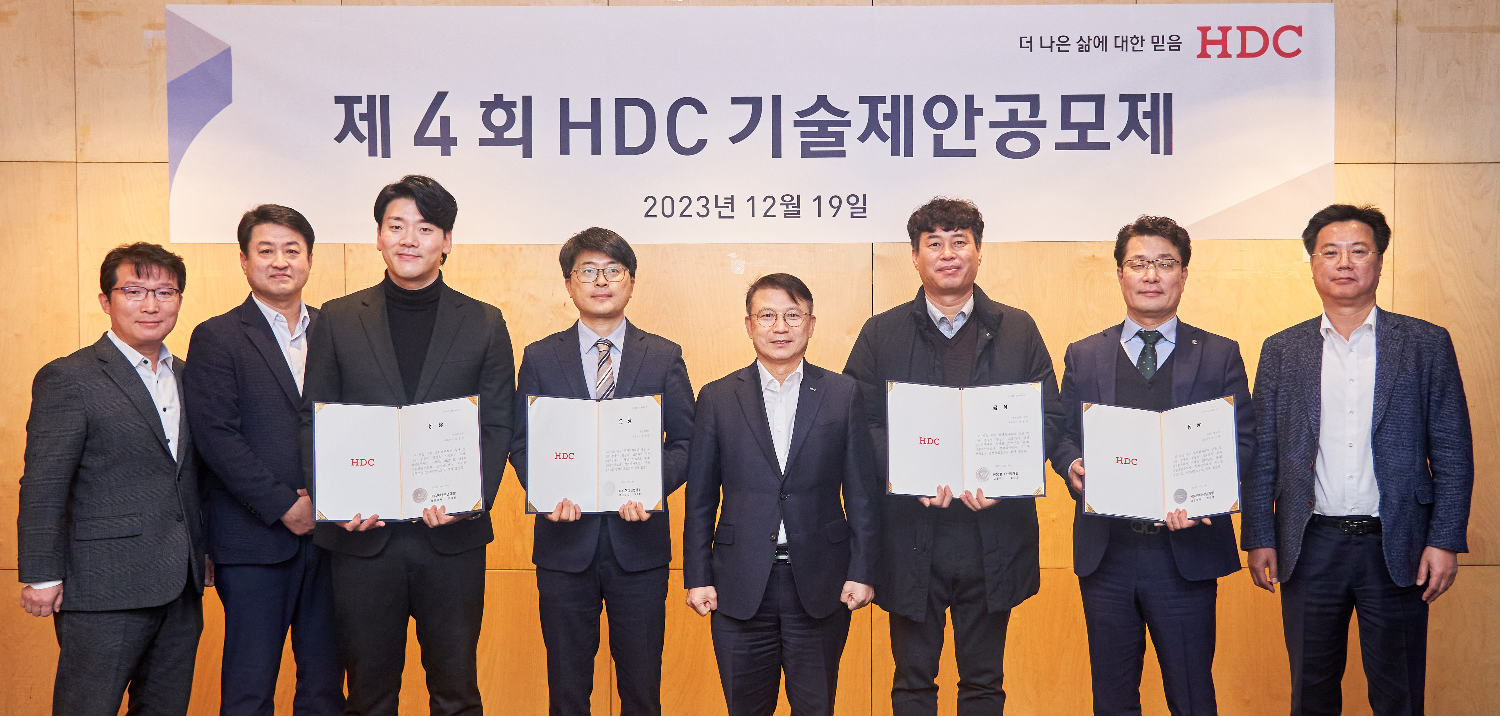 19일, HDC현대산업개발은 서울 용산구 본사에서 제4회 기술제안공모제 우수기술 제안을 선정하고 이에 대한 시상식을 진행했다. 지난 9월 19일부터 10월 31일까지 HDC현대산업개발 공식 홈페이지를 통해 ▲스마트 건설 ▲친환경·탄소저감 기술 ▲신사업 분야 ▲현장 안전·품질관리 기술 분야에서 총 44건의 기술 제안이 접수되었으며 서류 심사와 최종 PT 심사를 거쳐 건설 현장에 적용 가능한 4건의 우수작을 선정했다. 우수작으로 선정된 기업에는 기술개발지원금과 상장을 수여했다.