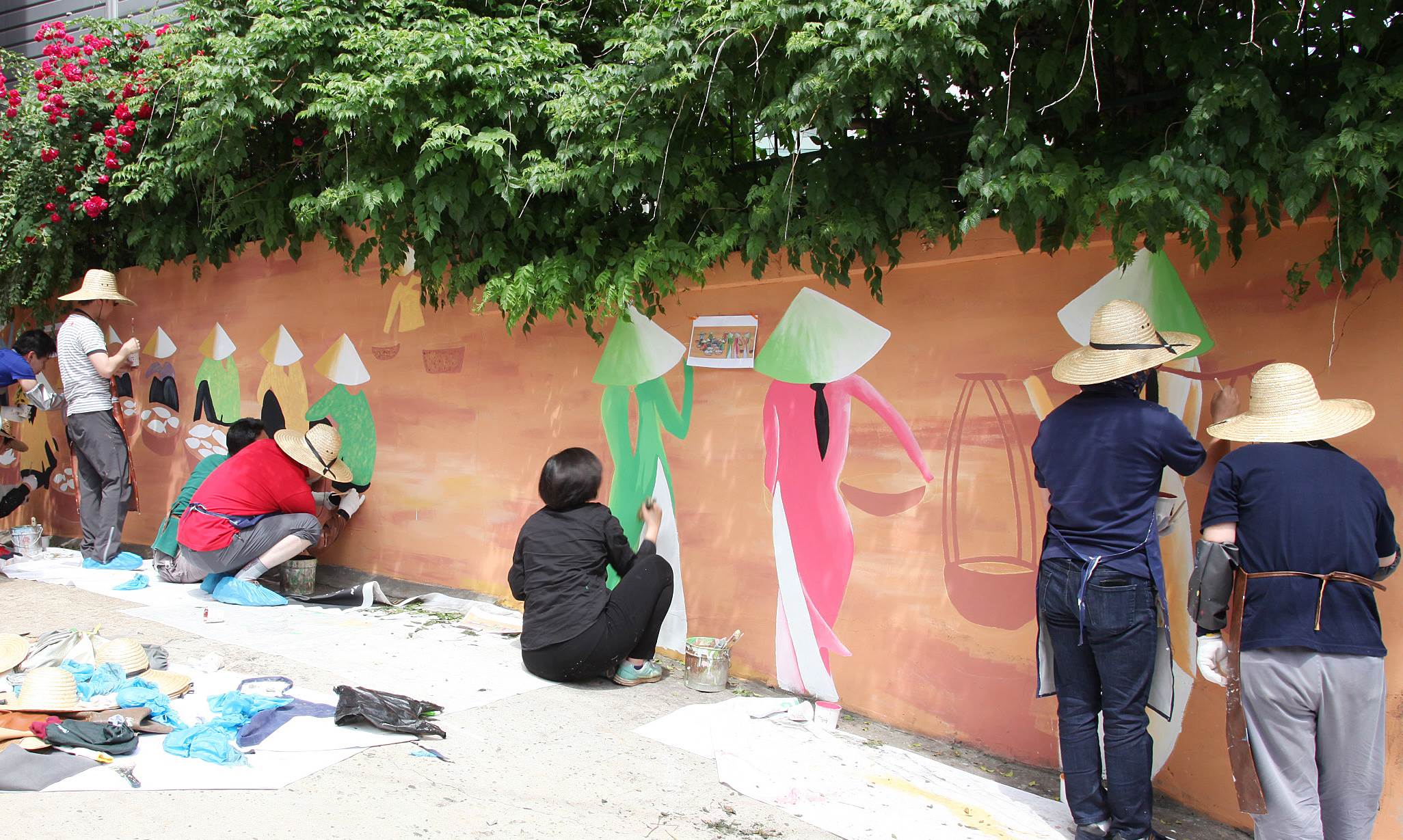 이날 벽화그리기는 현대산업개발 직원 50여 명이 참여한 가운데 서울 용산구 이태원로 26길을 베트남 문화의 거리로 꾸미는 작업으로 진행됐다. 총 연장 약 35m에 달하는 거리담장 및 마을계단 등에 벽화를 그렸으며, 비영리봉사단체 ‘드림인공존’과 협업했다.